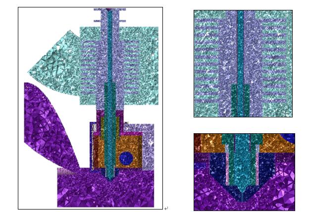 -上部散熱結(jié)構(gòu)及風(fēng)扇附近的強制對流(例如圖2中青色與紫色網(wǎng)格區(qū)域)??紤]到計算成本和結(jié)果精確度,此次仿真重點考慮這兩處流體區(qū)域?qū)囟确植嫉挠绊憽?/p>