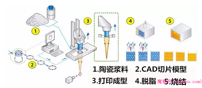 陶瓷件的3D打印包括配置陶瓷漿料、繪制三維模型并分層、3D打印成型、燒結(jié)等流程,其無需原胚和模具,就能直接根據(jù)計算機圖形數(shù)據(jù),通過增加材料的方法生成任何形狀的物體,簡化產(chǎn)品的制造程序,縮短產(chǎn)生的研制周期,提高效率并降低成本。