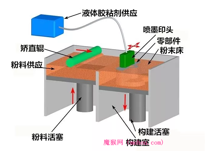IJP具有成型原理簡單,打印頭成本低,易產(chǎn)業(yè)化等優(yōu)勢;但噴墨打印頭堵塞,另外打印高度受限且不能打印內(nèi)部多孔結(jié)構模型,還要求粉末粒徑分布均勻,流動性好且高溫化學性質(zhì)穩(wěn)定。 4三維印刷工藝(3DP) 三維打印是由MIT開發(fā)出來的,首先將粉末鋪在工作臺上,通過噴頭把粘結(jié)劑噴到選定的區(qū)域,將粉末粘結(jié)在一起,形成一個層,而后,工作臺下降,填粉后重復上述過程直至做出整個部件。目前,以氧化鋯、鋯英砂、氧化鋁、碳化硅和氧化硅等陶瓷粉體為原材料。