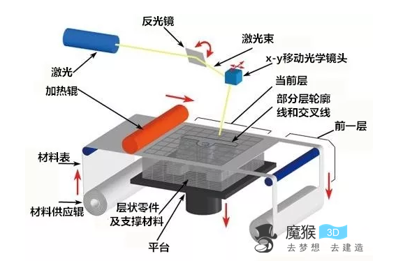 SLA具有成型精度極高陶瓷件燒結(jié)后致比重高的優(yōu)勢;但存在后續(xù)工藝麻煩,以及二次固化問題,另外,SLA難以加工折射率較高的陶瓷材料。 7疊層實體制造(LOM) 在層片疊加制造工藝中,將單面涂有熱溶膠的箔材通過熱輥加熱,由紙、陶瓷箔、金屬箔等構成的材料就會粘接在一起。然后上方的激光器按照CAD模型分層數(shù)據(jù),用激光束將箔材切割成所制部件的內(nèi)外輪廓,再鋪上新的一層箔材,重復上述過程,直至整個零部件打印完成。