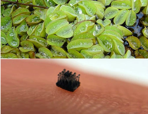 它就是Salvinia molesta,是一種原產(chǎn)于南美洲的浮蕨。它的葉子非常疏水,并且淹沒在水中時保留了一個空氣袋,這要歸功于細(xì)小的防水毛發(fā)。
